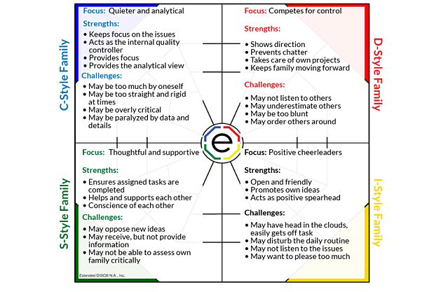 در جشن ها ممکن است D و C بحث کنند که چه کسی درست می گوید، در حالی که، I و S در تلاش هستند تا آرامش خود را حفظ کنند و همه را راضی نگه دارند. نکته اصلی در برقراری ارتباط موفق خانواده، داشتن یک برنامه مؤثراست. ابتدا از سبک رفتاری خود و نحوه ترجیح انجام کارها آگاه باشید. سپس در نظر بگیرید که چگونه می توانید ارتباط خود را با هر یک از اعضای خانواده و در درون خانواده بهبود بخشید. با اعضای خانواده، کمتر احتمال دارد که سبک خود را تنظیم کنیم. حتی ممکن است انتظار داشته باشیم که اعضای خانواده به سبک مورد نظر خود ارتباط برقرار کنند.